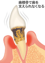 歯を支えている顎の骨(歯槽骨)がほとんど溶けてしまうため歯根(歯の根っこ)が露出し、歯はものが咬めなくなるほどグラグラな状態になります。